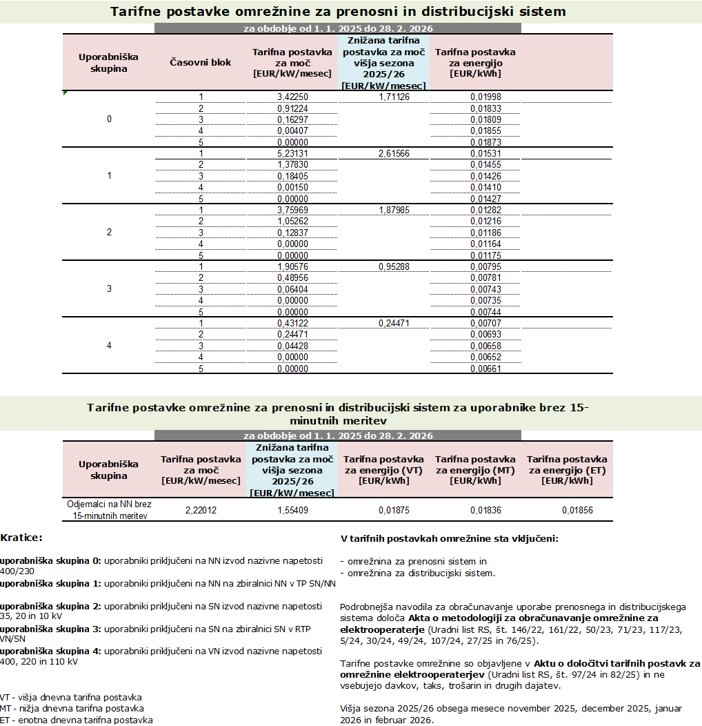 Od 1.1.2025 do 28.2.2026 se uporabljajo tarifne postavke, ki so prikazane spodaj: